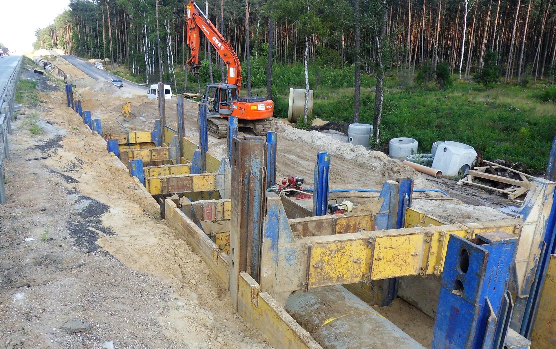 zobacz zdjęciaJedna z pierwszych realizacji systemu STALRENT SRR, gdzie wzdłuż nowo budowanej drogi ekspresowej do osadzenia było kilkanaście zbiorników retencyjnych o średnicy 3 m oraz długości od 20-40 mb. System SRR był alternatywą do technologii wbijania grodzic. Przęsła tego systemu wynosiły 4 m a światło wykopu 5 m. Szalunki w zasadzie były pogrążane w piaszczystą skarpę drogi co w rezultacie skutkowało o bardzo szybkim postępie wykonywania prac i zadowoleniem wykonawcy z doboru zabezpieczenia wykopu.