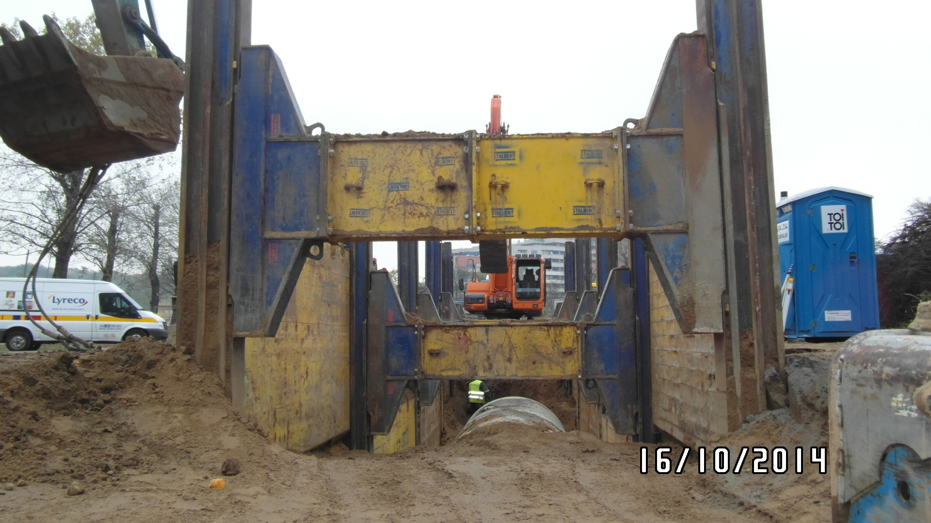 zobacz zdjęciaJeden z kilku zestawów komór startowych oraz odbiorczych. Rozwiązanie jest połączenie systemów słupowych STALRENT narożnego oraz liniowego z zastosowanie ścian czołowych dylowych. Część komór dzięki dwóm ścianom czołowym opartych o profile KD 6/8 pełniła funkcję zarówno odbiorczą jak i startową. Cały proces realizacji ze względu na ilości wykonywanych przejść został skrócony dzięki zwiększonej mobilności systemu w stosunku do tradycyjnych ścianek szczelnych.