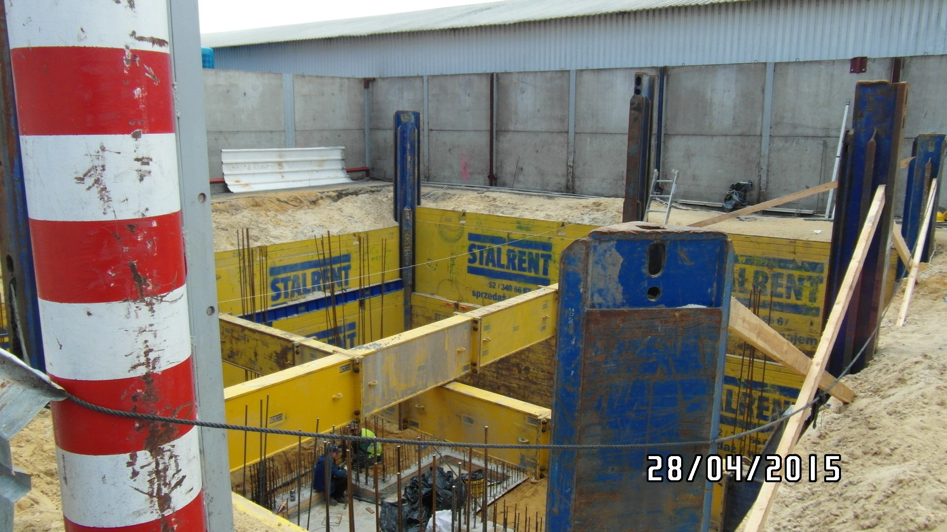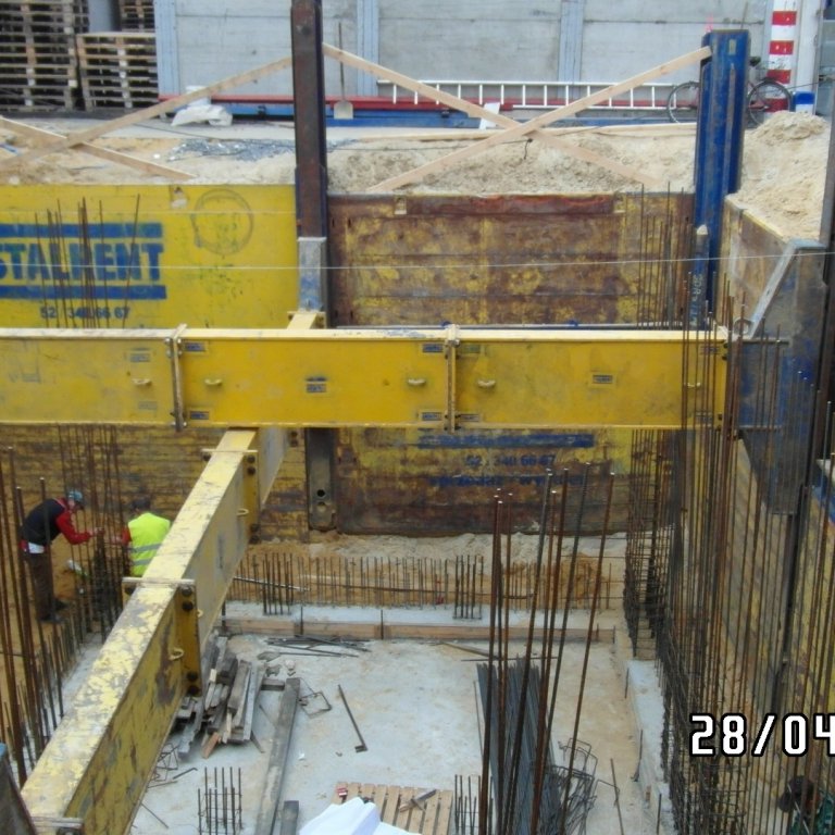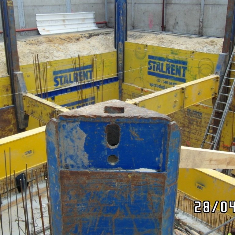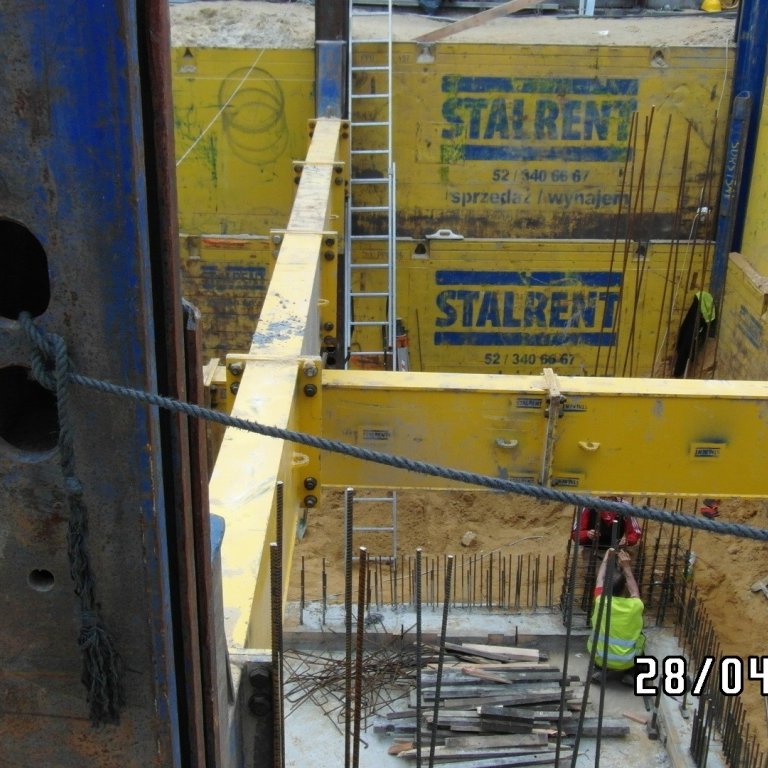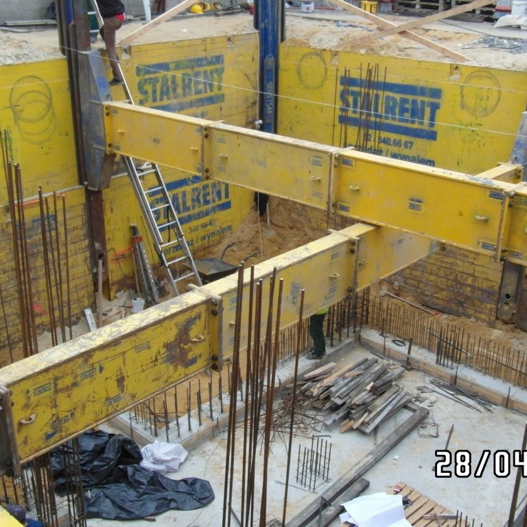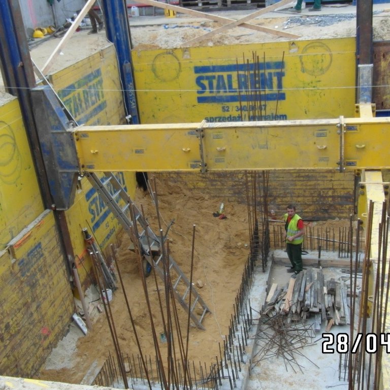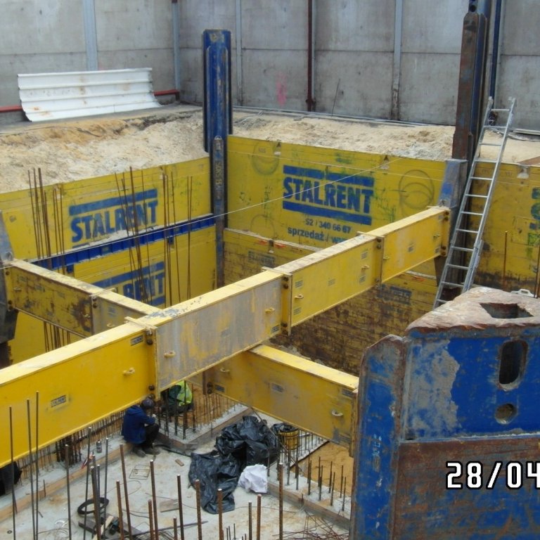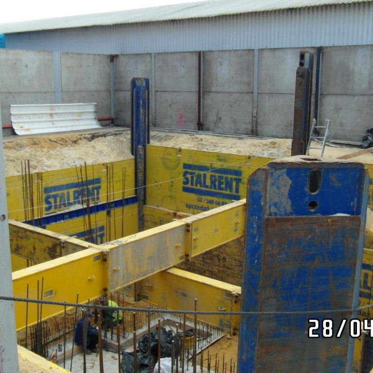 System słupowy liniowy SRR z wykorzystaniem słupów narożnych zastosowany przy modernizacji zakładu produkcyjnego branży spożywczej. Prezentowana realizacja miała na celu oszalowanie wykopu dla potrzeb wbudowania zbiornika na groszek spożywczy. Ograniczona ilość miejsca determinowała dopasowanie systemu w taki sposób aby projektowany zbiornik został zbudowany zgodnie z założeniem a jednocześnie całość inwestycji nie powodowała naruszenia istniejącej infrastruktury. Zastosowanie rozpór rolkowych nie tylko pozwoliło uzyskać żądane wymiary ale również umożliwiło swobodną budowę zbiornika już w szalowanym wykopie. Całość przedsięwzięcia została zrealizowana siłami własnymi inwestora przy wsparciu merytorycznym STALRENT co znacznie ograniczyło koszty oraz skróciło czas realizacji inwestycji.