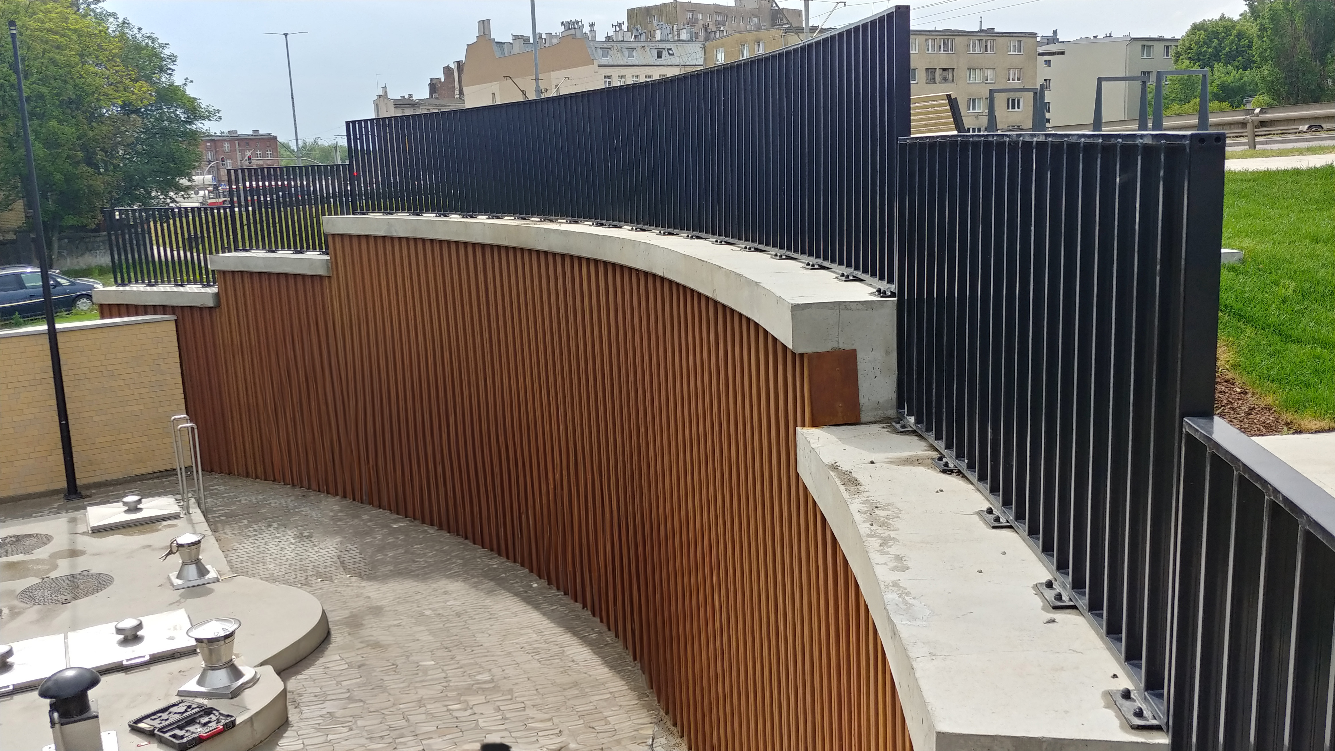 W jednej z gdańskich realizacji kształtowniki szalunkowe KS 3,25 wykorzystano w sposób nietypowy — poza standardową funkcją zabezpieczania wykopów stały się elementem architektury terenu. Profile o naturalnej, postindustrialnej patynie zestawiono z betonem oraz czarnymi barierkami, co pozwoliło uzyskać elegancki, modernistyczny efekt. Takie kreatywne zastosowanie materiałów technicznych podkreśliło charakter przestrzeni, łącząc funkcjonalność z estetyką.