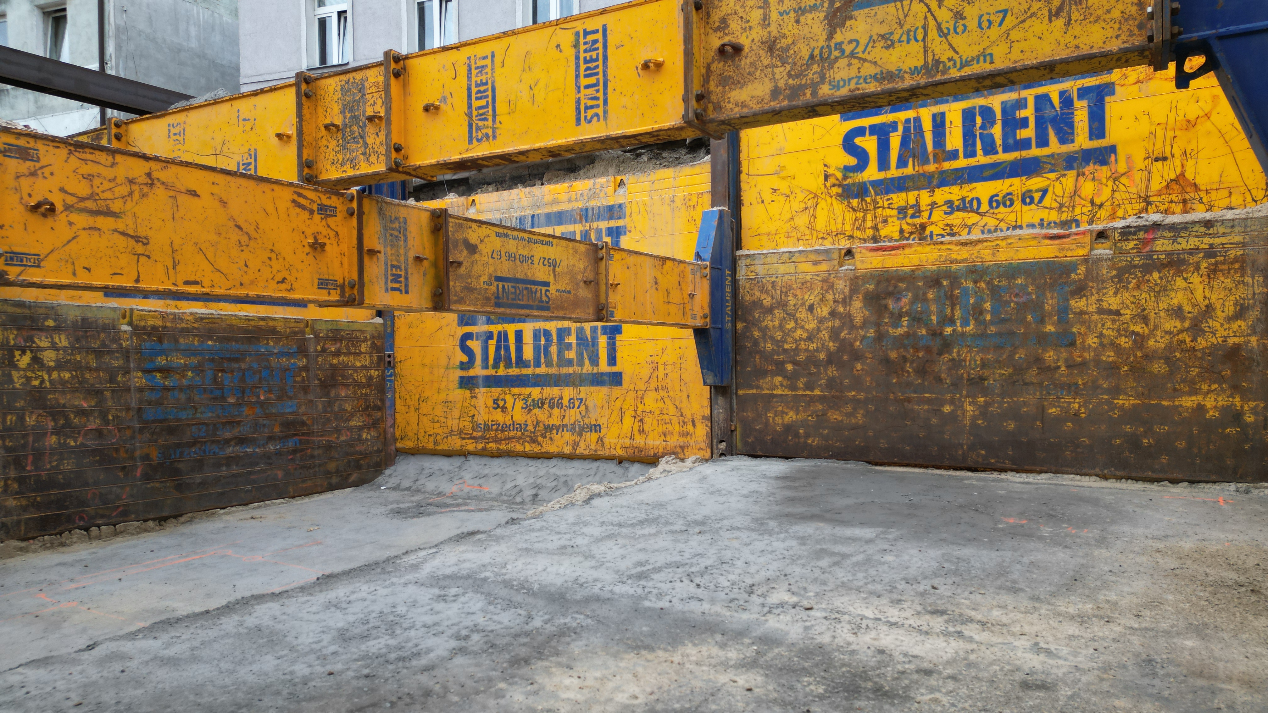 zobacz zdjęciaZabezpieczenie wykopu systemem liniowym STALRENT SRR na budowie stacji Metra w Warszawie przy ulicy Płockiej. Na tym zadaniu Wykonawca stosował różne konfiguracje systemu szalunków typu płytowo - słupowego. Większość robót odbywała się po zabezpieczeniu wykopów na ponad 6 m głębokości. Ze względu na mocno zurbanizowany teren oprócz pełnych płyt szalunkowych stosunkowo często korzystano z komór dylowych o różnych wymiarach wraz z profilami KD 6/8, co pozwalało bezpiecznie szalować wykop w obrębie kolizji . Obok szalunków do zabezpieczenia wykopów STALRENT SRR stosowano na tym zadaniu także ściankę berlińską oraz grodzice stalowe.