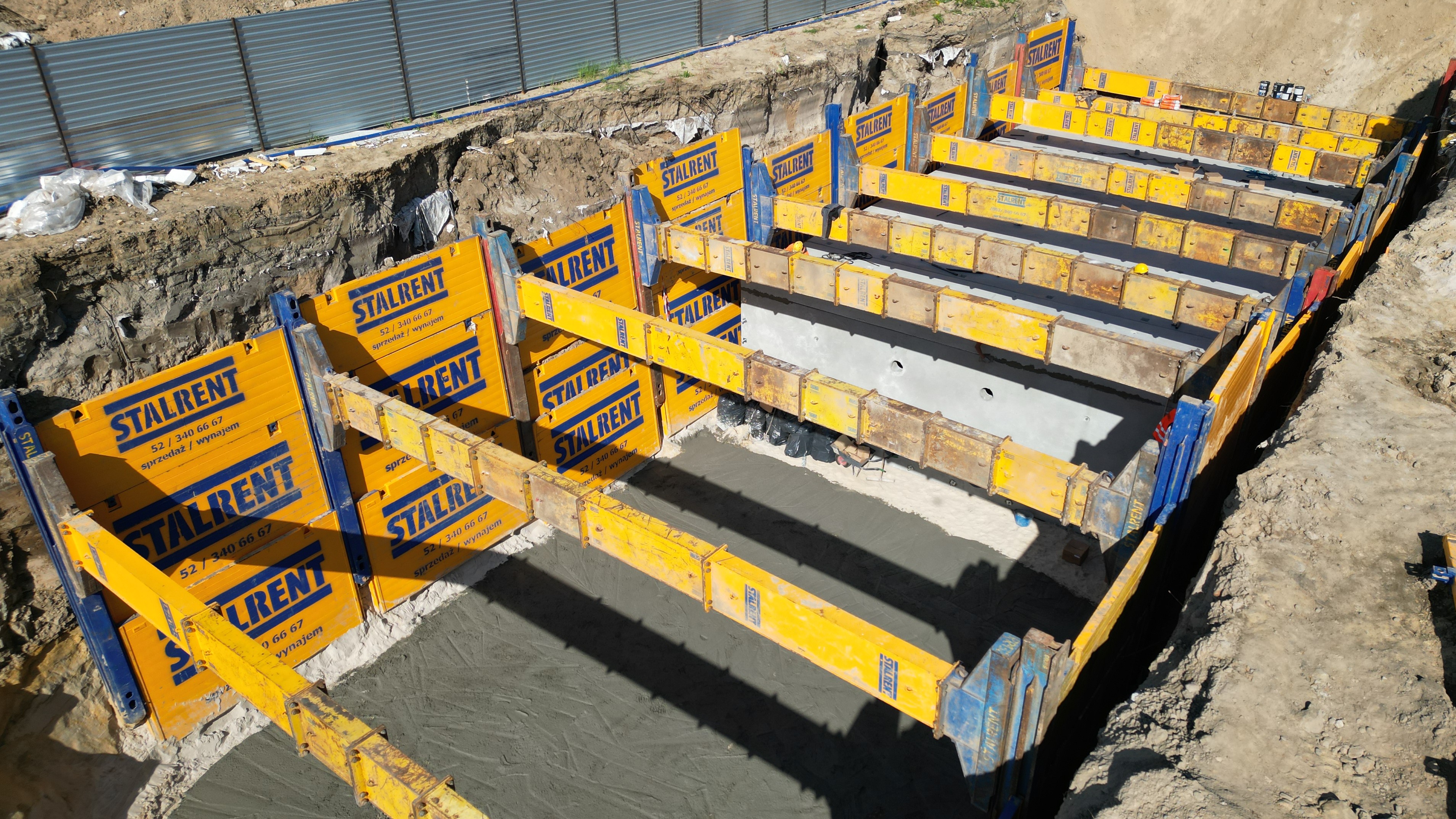 zobacz zdjęciaNiecodzienne zabezpieczenie wykopu ze względu na montaż szalunków słupowych STALRENT SRR wewnątrz hali produkcyjnej w Gostyninie. Zadaniem Wykonawcy było wybetonowanie fundamentów na głębokości 3,5 m pod maszyny produkcyjne. Wykop o takiej głębokości należało zabezpieczyć. Pierwotnie Wykonawca przewidywał zastosowanie grodzic stalowych. Jednak dobór szalunków słupowych STALRENT SRR i błyskawiczna ich dostawa oraz brak wibracji przy instalowaniu tego systemu okazał się strzałem w dziesiątkę. Ponadto montaż szalunków STALRENT SRR za pomocą suwnicy i koparki, szczególnie wyciąganie płyt, okazał się bardzo wydajny, z czego Wykonawca mógł się tylko cieszyć.