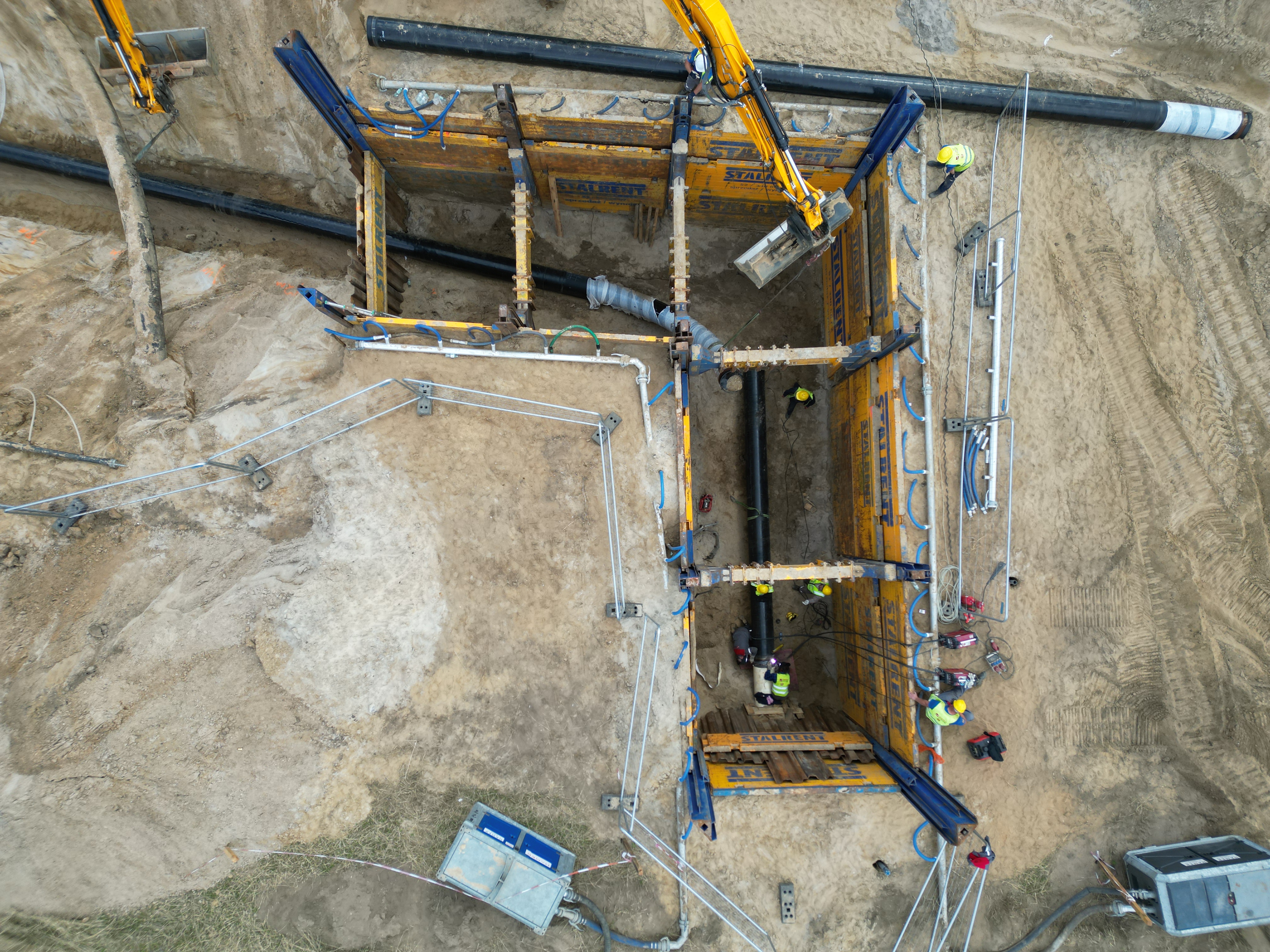 zobacz zdjęciaJeden z etapów rozległej budowy w centrum Jarocina. Sporym wzywaniem okazało się dopasowanie komory startowej oraz odbiorczej dla przewiertów, tak aby pozostawić wystarczającą dla prac przewiertowych ilość miejsca wewnątrz szalowania, a jednocześnie „zmieścić” cały system w planowanym dla budowy obszarze zajęcia. Zastosowanie ścian dylowych w szczytach komory, pozwoliło komfortowo wypuścić przewiert oraz przyspieszyć cały proces realizacji zadania.