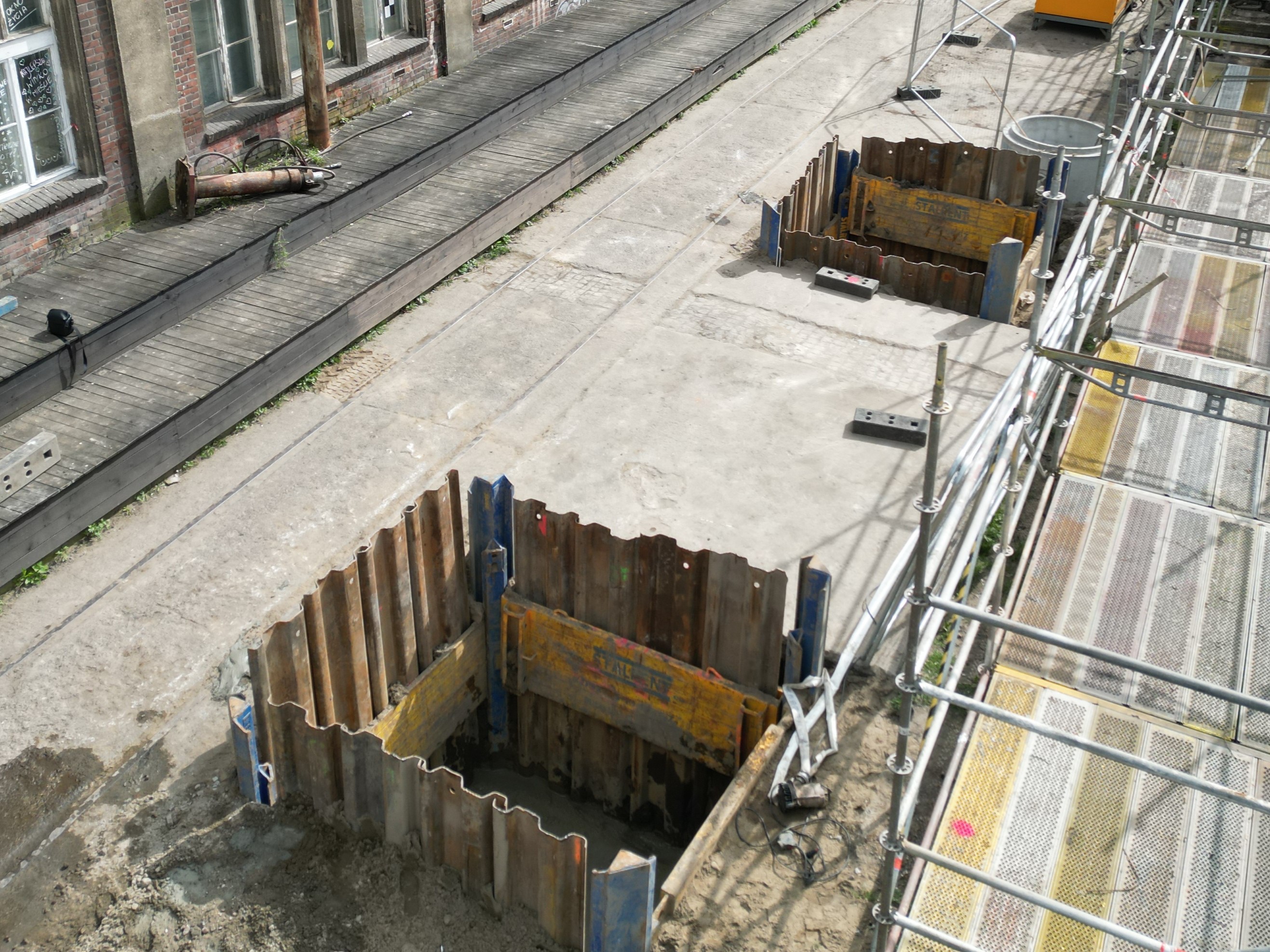 aż 3,7 m. Ze względu na ograniczoną przestrzeń oraz znaczną głębokość wykopów zastosowano system SDR/SRR, który zapewnił stabilne i bezpieczne zabezpieczenie ścian wykopu.