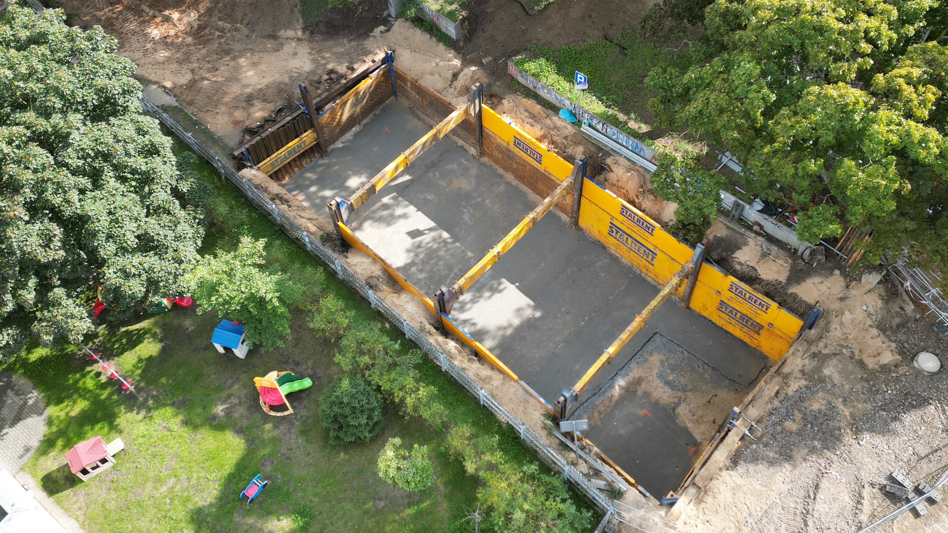 zobacz zdjęciaPrzy ul. Stawowej w Bydgoszczy realizowano budowę zbiornika retencyjnego w ramach miejskiego programu modernizacji sieci deszczowej. Wykop zabezpieczono systemem SDR/SRR z odciążeniem HEB po szerokości komory, co zapewniło odpowiednią sztywność i bezpieczeństwo konstrukcji. Zastosowane rozwiązanie pozwoliło prowadzić prace w kontrolowanych warunkach, mimo znacznych wymiarów komory.