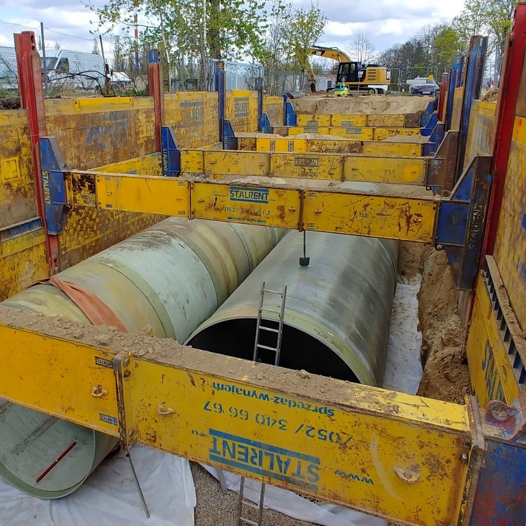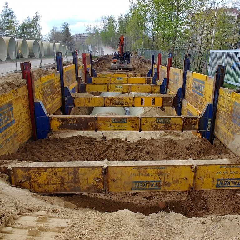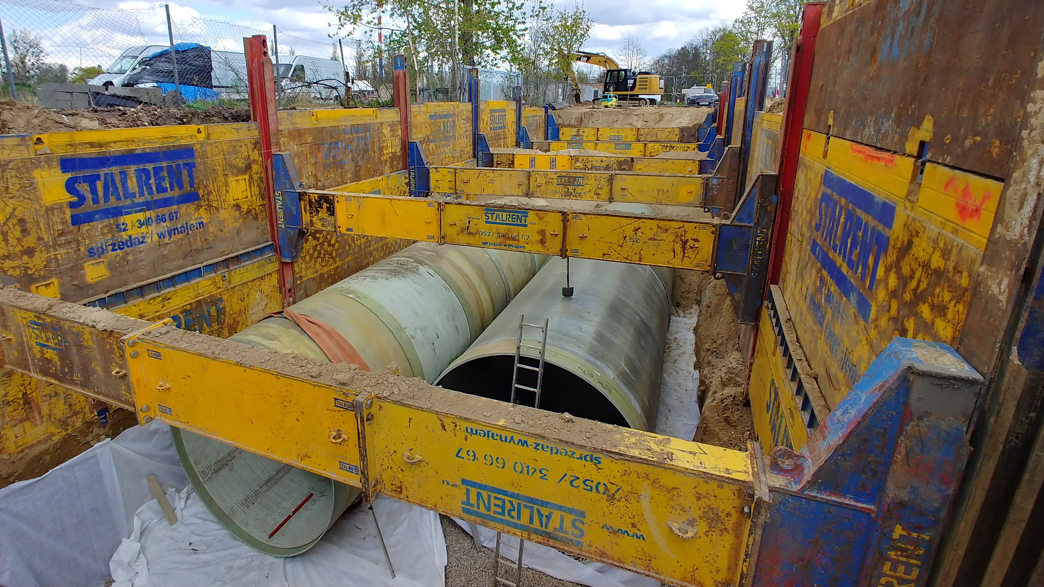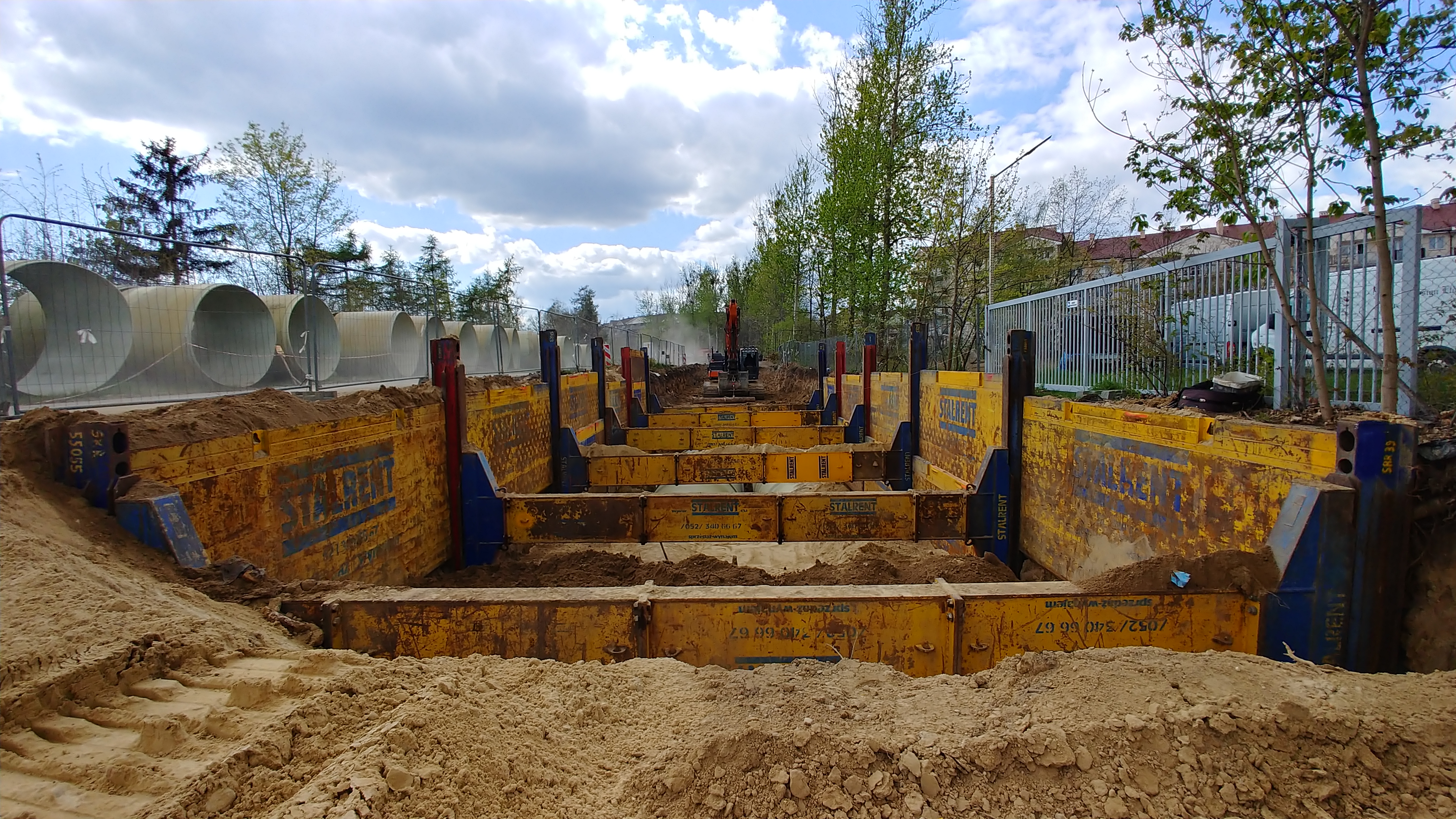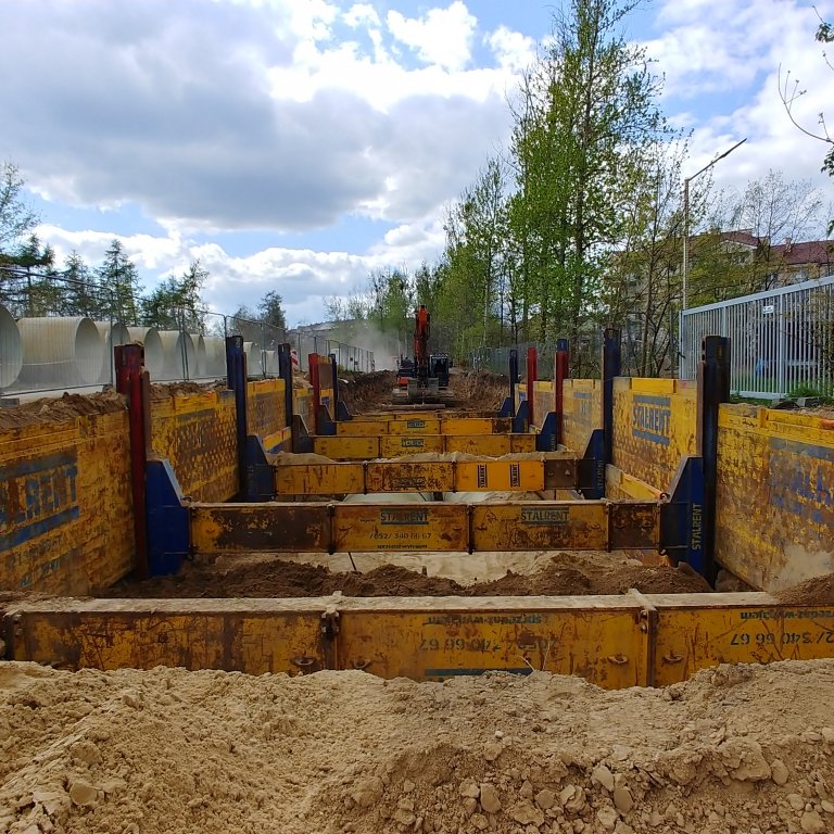 Realizacja w Gorzowie Wielkopolskim była częścią projektu „Zagospodarowanie wód opadowych na terenie Miasta Gorzowa Wlkp.” i obejmowała budowę dużego zbiornika retencyjnego. W zabezpieczonym wykopie umieszczono naraz dwa zbiorniki o znaczących gabarytach. Do wykonania prac wykorzystano system słupowy SRR o wyjątkowo dużej szerokości — aż 8 metrów. Zastosowane rozwiązanie zapewniło stabilność konstrukcji wykopu oraz umożliwiło sprawną realizację robót w wymagających warunkach terenowych. Dzięki temu prace przebiegły bezpiecznie i zgodnie z założeniami projektowymi.